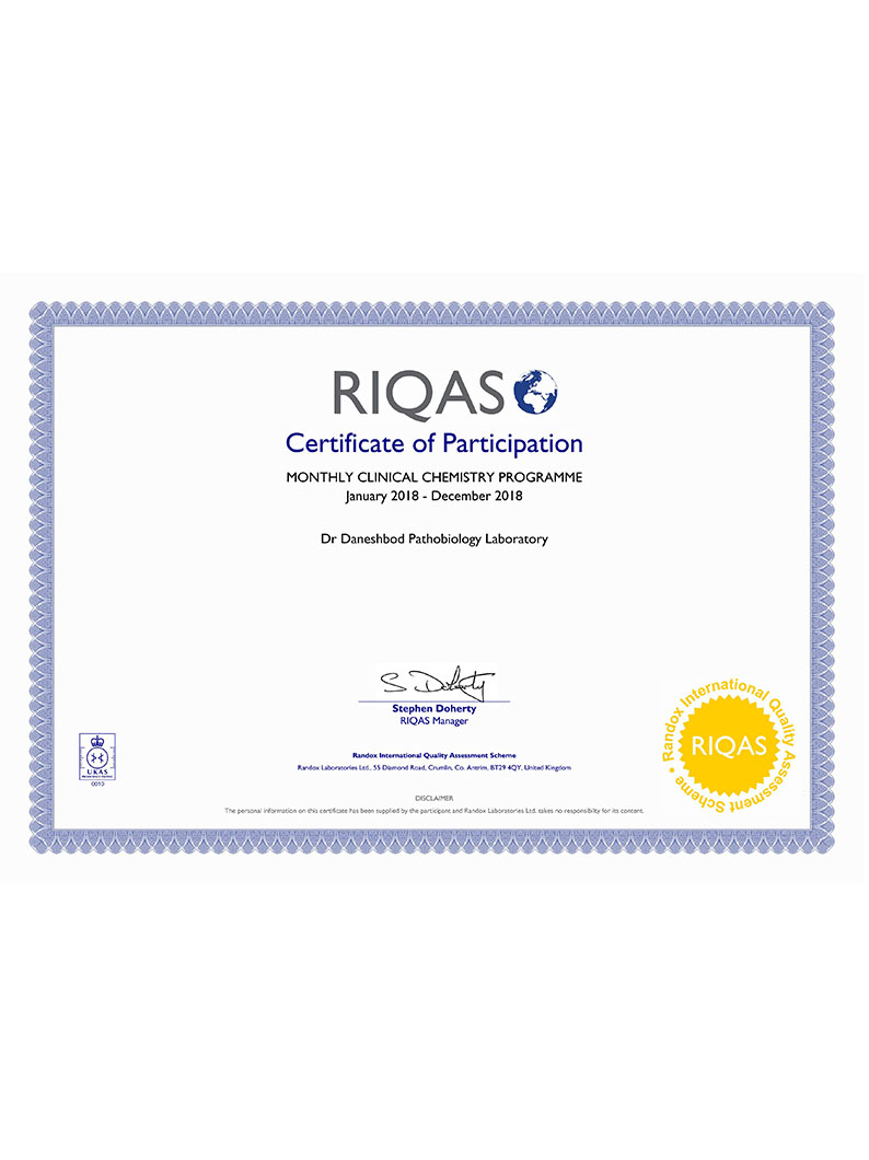 گواهی کنترل کیفی خارجی بیوشیمی از RIQAS انگلستان